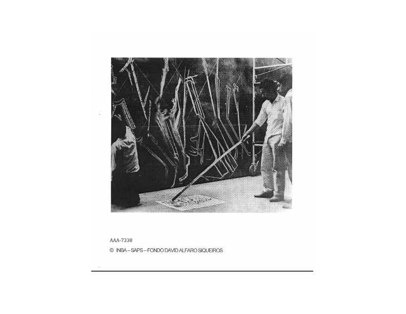 A la par de mis visitas a la Sala, leí algunos libros escritos por Siqueiros que me fueron introduciendo a su vida y obra, visité todos los murales (accesibles) que hizo en la ciudad y revisé el material visual que utilizó para trabajar. Simultáneamente, me reuní con algunos amigos para conversar sobre una serie de conceptos que, desde mi perspectiva, atraviesan la obra de Siqueiros tanto en el plano formal como ideológico. Conversamos por ejemplo sobre la idea de solidez, concentración, restricción, pero también de sus opuestos: ligereza, dispersión, fluidez. Hablamos y en algunos casos chateamos. Todo ese material lo utilicé para construir un cruce de información entre lo que revisé y seleccioné libremente en el archivo y lo que reflexionamos mis amigos y yo.